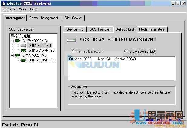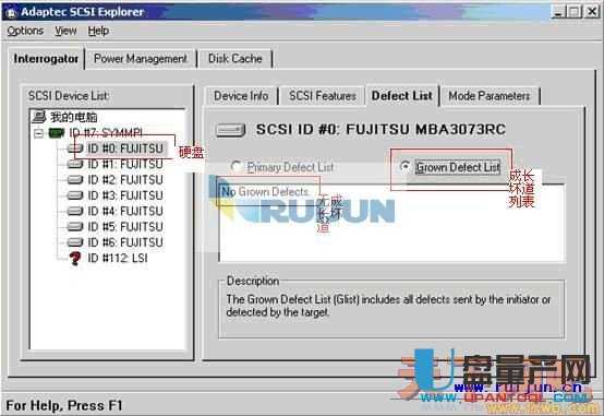 4.其中ID#0:FUJITSU(表示第一组通道的第一个盘)Grown Defect List 就是查看成长坏道,如果没有成长的话,里面显示信息就是No Grown Defects