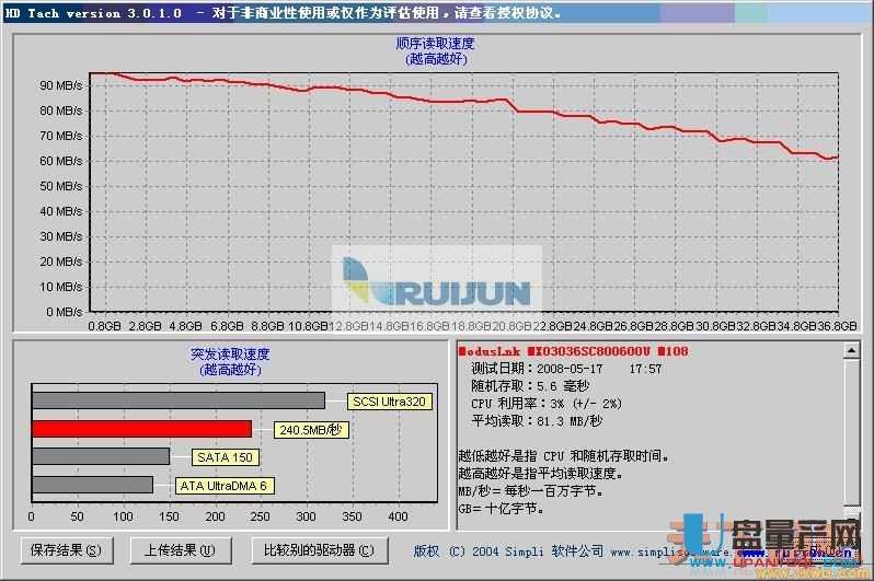 3.下图为15K 富士通 MAX36G SCSI的标准测试图,大家注意图上显示随机存取速度为5.6毫秒;