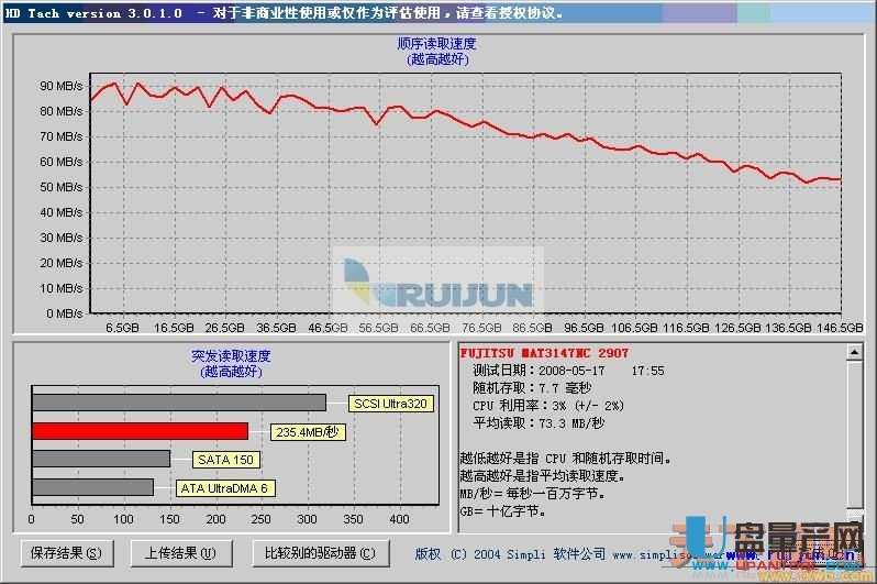 2.下图为10K 富士通MAT 147G SCSI的标准测试图,大家注意图上显示随机存取速度为7.7毫秒