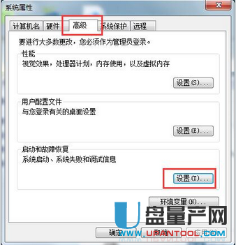 3、接着可以在“系统属性”窗口,直接选择高级选项,并点击启动和故障恢复的设置。