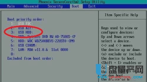 2、在故障电脑上插入已制作好的U盘。按电源键打开系统故障电脑,弹出屏幕后底下有一行英文提示,按提示操作,一般是按F2键进入bios界面。然后按键盘中的上下左右键中的左右键,接着按上下键选中“boot中的3: USB HDD”(选中以后,这行字会变为白色的),变成白色字体后,按F10(下方有提示F10 Save and Exit),接着按Y(yes)就保存了设置。