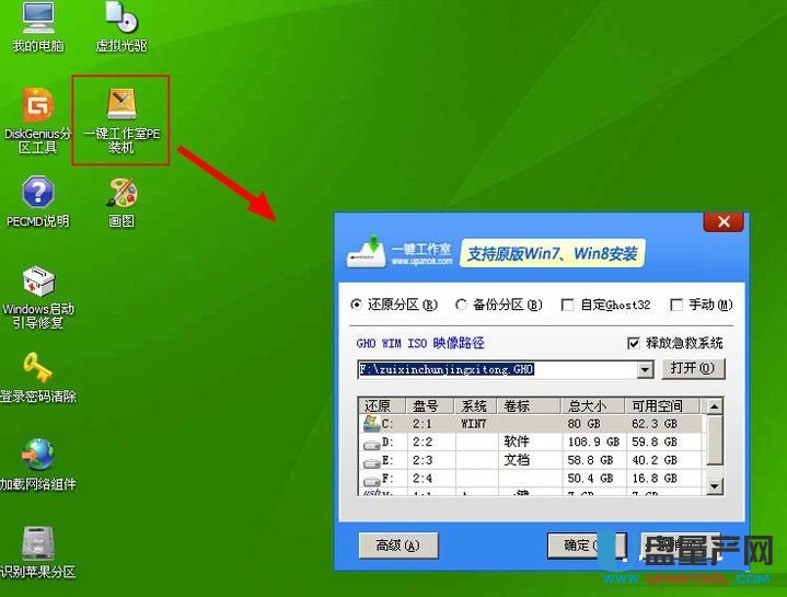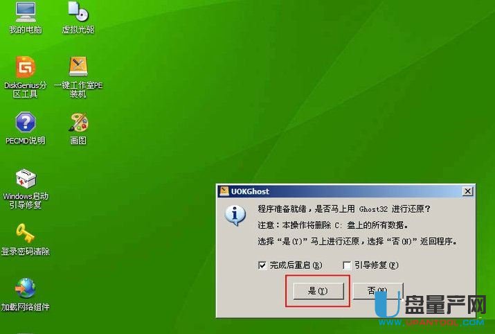 5、接着进入到WindowsPE中,开始恢复系统,如图。点击PE装机,点击“确定”(因为软件会自动识别ghost映像文件路径,所以无需你再怎么选择操作)。