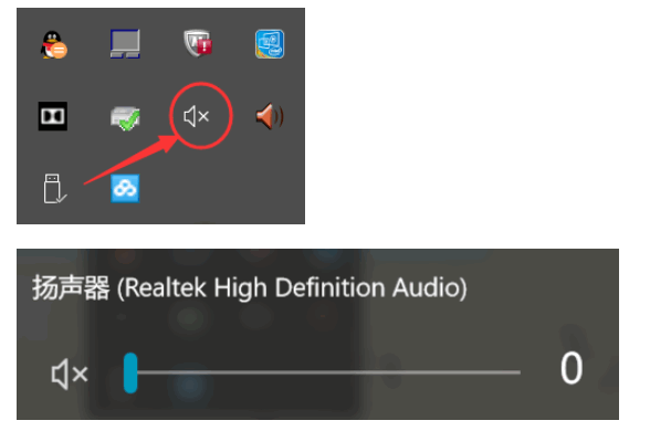 情况一、比如win10系统,我们点右下角的托盘位置,会看到一个喇叭形状的图标,这个就是声音状态显示的图标了,我们先查看是不是误按了静音键导致的无声音,比如下图这样一个X的喇叭图标就说明按到静音了。