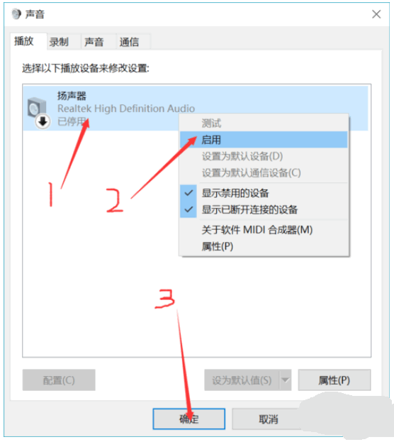 如果播放设备窗口,如下图这样,扬声器显示已停用的话,就说明问题的原因是声音播放设备被禁用了,那么我们如下图这样选扬声器点鼠标右键,然后点启用,然后点确定就行了。