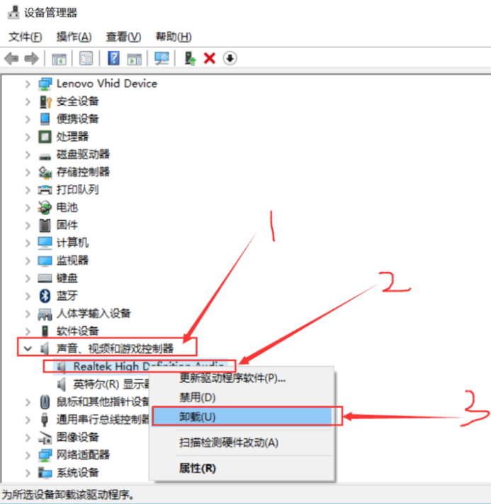3、然后点声音、视频和游戏控制器项,如下图展开后点realtek high就是声卡驱动了,选中点鼠标右键,然后点卸载