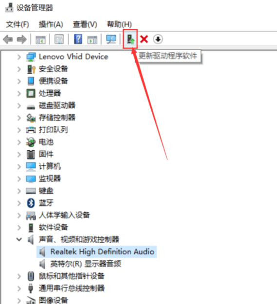 4、卸载后,我们点更新驱动程序软件,如下图这个图标点它,就会自动重新安装声卡驱动了。
